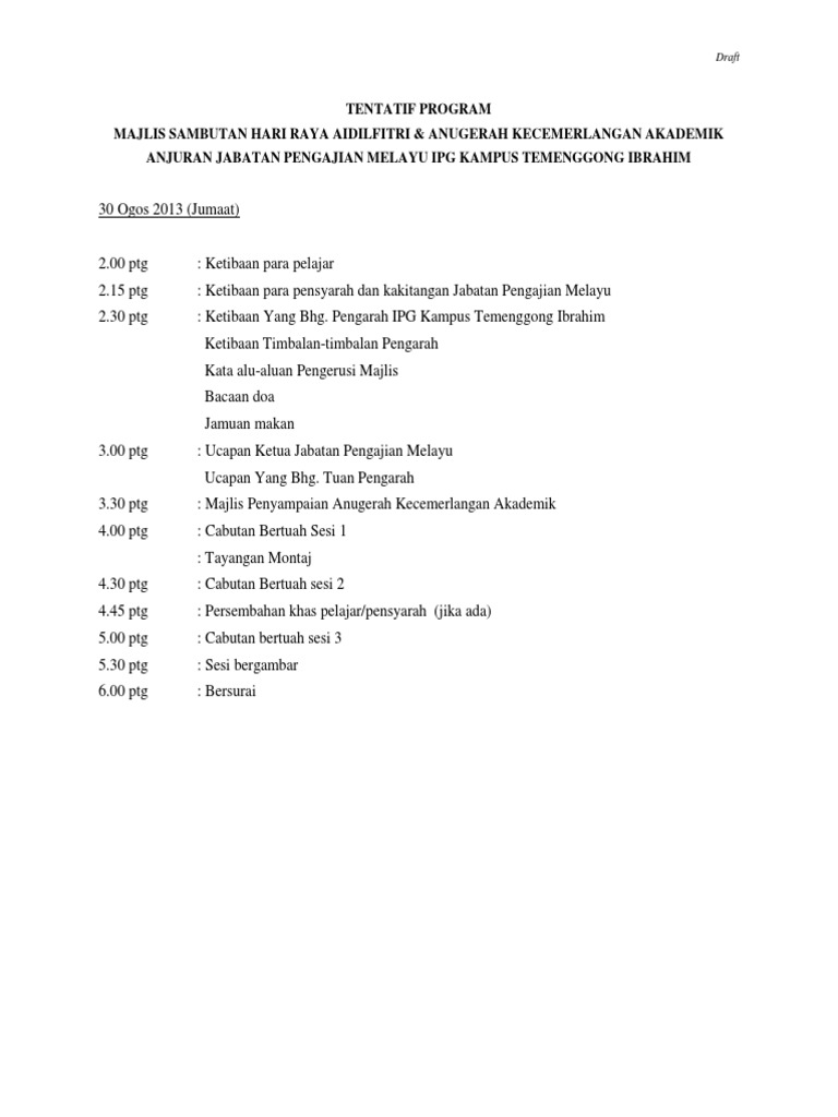 Lampiran B TENTATIF PROGRAM. Up to 3 cash back Open navigation menu. TENTATIF TERKINI UNTUK MAJLIS SAMBUTAN HARI GURU DAN HARI RAYA AIDILFITRI.